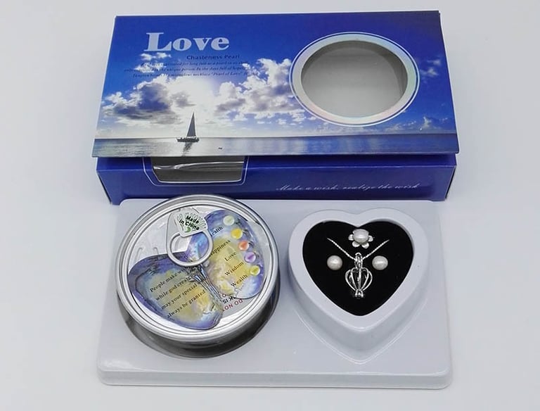 صدفة حقيقية بداخلها لؤلؤة طبيعية مجهولة اللون، مع طقم مجوهرات أنيق يشمل سلسلة وخاتم وحلقين.